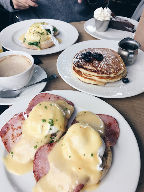 Alors je sais, c'est bien mignon tout ça, mais : qu'est ce qu'on mange ? Je vous laisse jeter un oeil au menu ici, mais sachez que vous ne serez pas déçu 😉 De notre côté nous avons testé les oeufs Florentine, les oeufs Benedict, les pancakes et V. s'est pris un gâteau chocolat en plus (je ne sais vraiment pas où il met tout ça !).