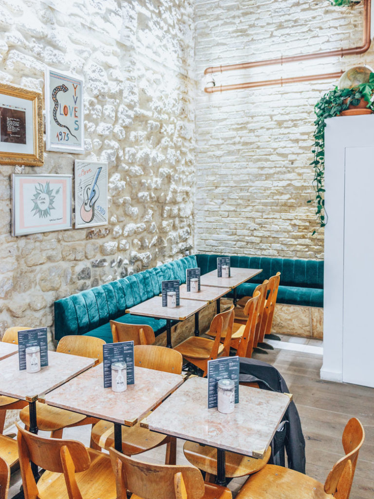 Avec ses murs en pierre, sa grande banquette bleue canard au fond de la pièce et sa cuisine ouverte, on se sent tout de suite bien chez Café Foufou. Entre le plafond tout en miroir, les tables en marbre rose et la jolie vaisselle, pas de doute, la décoration a été pensée pour être photogénique !