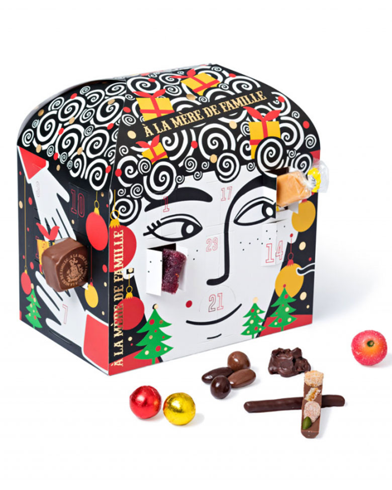Pour son 7e calendrier de l'avent A la mère de famille (une des plus anciennes chocolateries de Paris) s'associe avec l’artiste Zeina Abirached. Au niveau du contenu on y trouve un assortiment surprise de 24 spécialités de chocolats et confiseries (pralinés, amandes et noisettes au chocolat, mini calissons, caramels, roudoudous, etc.)