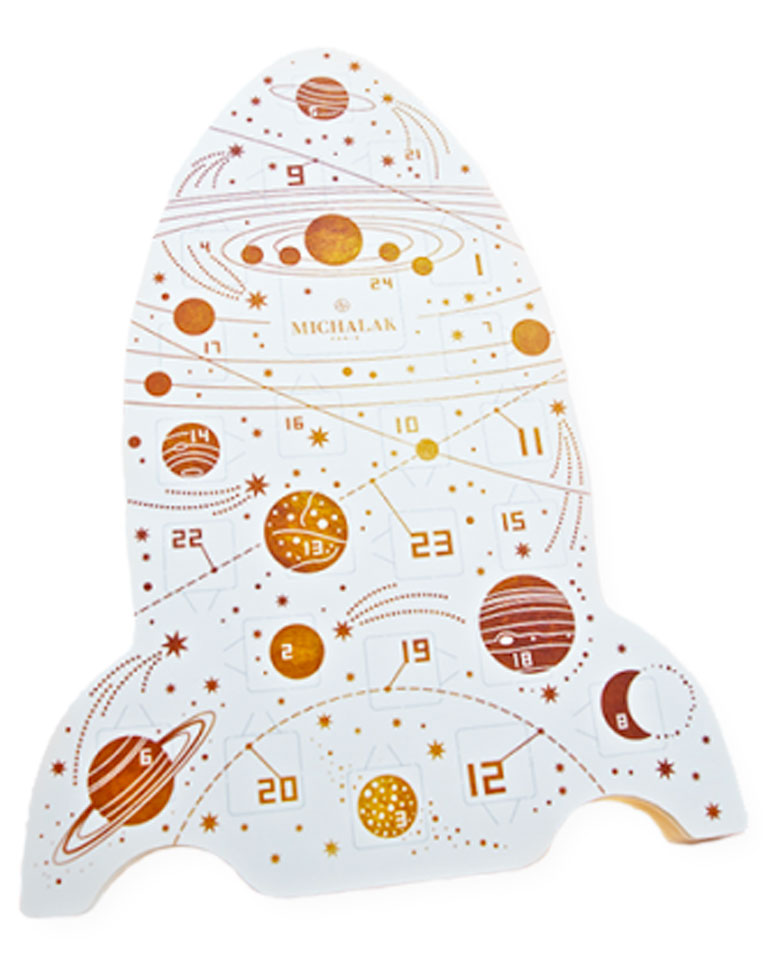 On ne présente plus Christophe Michalak ! Cette année encore, il sort son calendrier de l'avent en forme de fusée pour nous mettre des étoiles plein les yeux. A l'intérieur on retrouve un assortiment de bonbons et de chocolats signatures.
