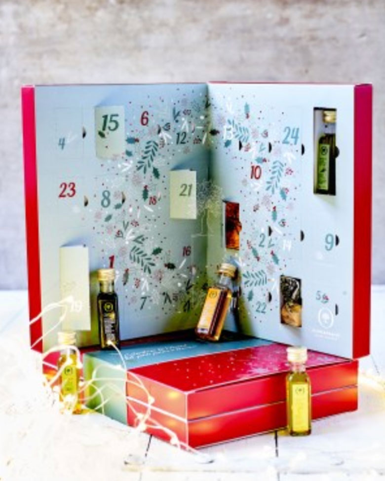 Pas envie de chocolat tous les jours ? Oliviers & Co propose un bel équilibre entre le sucré et le salé. Dans ce calendrier, on retrouve des huiles aromatisées pour cuisiner, des vinaigres et des truffes au chocolat.