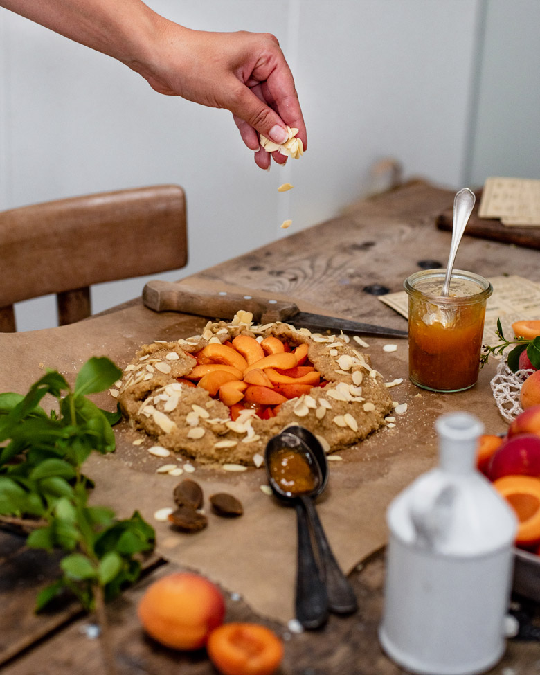 - Rabattre les bords de la pâte sur les abricots et saupoudrer du reste de cassonade et d'amandes effilées.