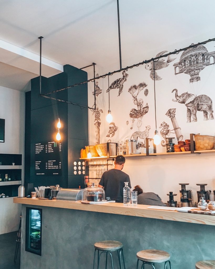 Au niveau de la décoration, on trouve un mélange de bois, de métal et de plantes. Au mur derrière le comptoir ? Du papier peint aux motifs dessinés exprès pour l'endroit. En résumé, on se retrouve dans une atmosphère industrielle et tropicale à la fois.